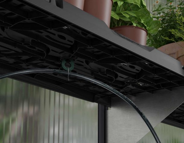 Valmistatud vastupidavast polüpropüleen plastikust, iga riiul talub kuni 20 kg ühtlaselt jaotunud kaalust, ning kaasas on kronsteinid ja kinnitused, mida on vaja kasvuhoone seinale või nurka hõlpsaks kinnitamiseks. Kasvuhooneriiulitel on drenaažiavad, mis võimaldavad koguda liigseid taime-, pinnase- ja veejäänuseid, ja mõlemal on kaks sälku aiatööriistade hoidmiseks. Kinnitatakse kasvuhoone raami külge ja saab lisada igale seinale või nurka ning hõlpsasti