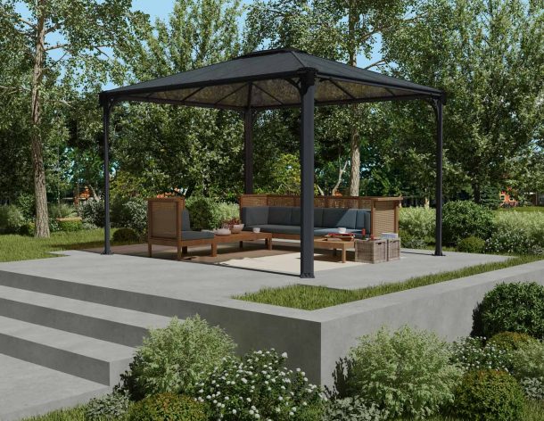 Palram Martinique on vastupidav ja stiilne varikatus. Paviljonil on vastupidav, roostekindel ja antratsiithall pulbervärvitud alumiiniumraam ning tsingitud terasest liigendid. 100% UV-kaitsega 6 mm polükarbonaat paneelid kaitsevad kahjulike UV-kiirte, vihma ja lume eest. Pronksitooni paneelid lasevad loomulikku valgust läbi ja annavad siiski piisavalt varju.